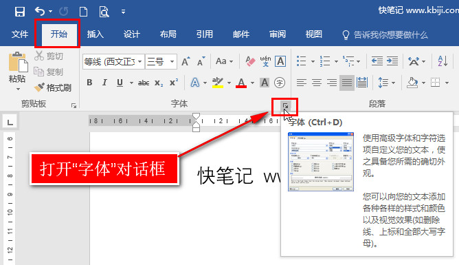 Word 2016的“字体”对话框主要用于对文档中的文字字体格式进行编辑,可以设置文字的字体、字体大小、字体效果等,我们通过: