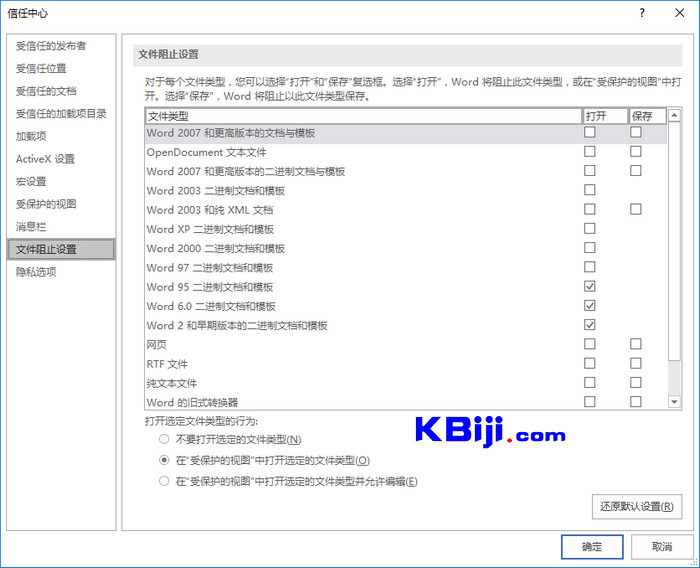 4、在“信任中心”窗口中,单击“文件阻止设置”,然后清除要打开或保存的文件类型的“打开”或“保存”复选框。