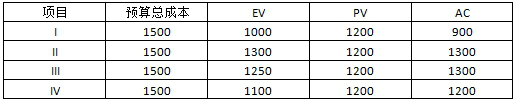● 项目Ⅰ、Ⅱ、Ⅲ、Ⅳ的工期都是三年,在第二年末其挣值分析数据如下表所示。按此趋势,项目(56)应最早完工。